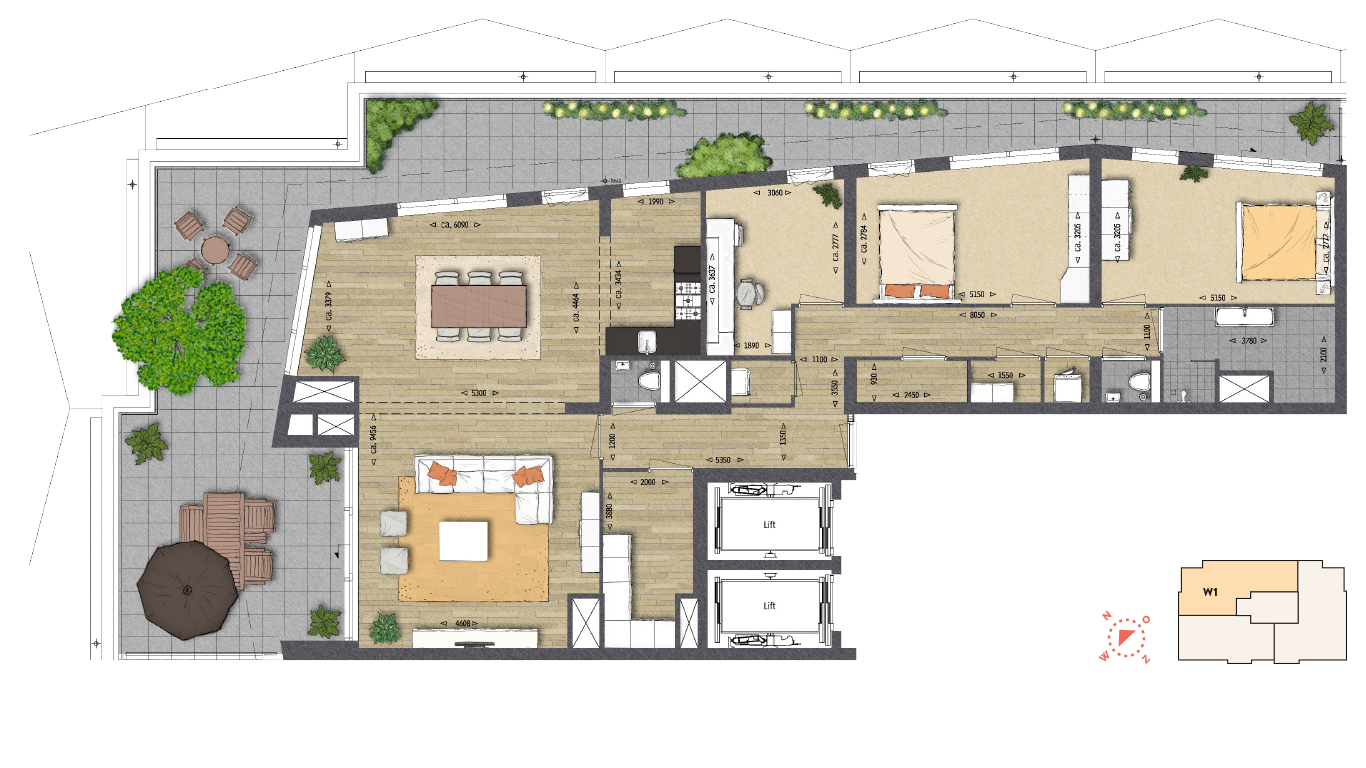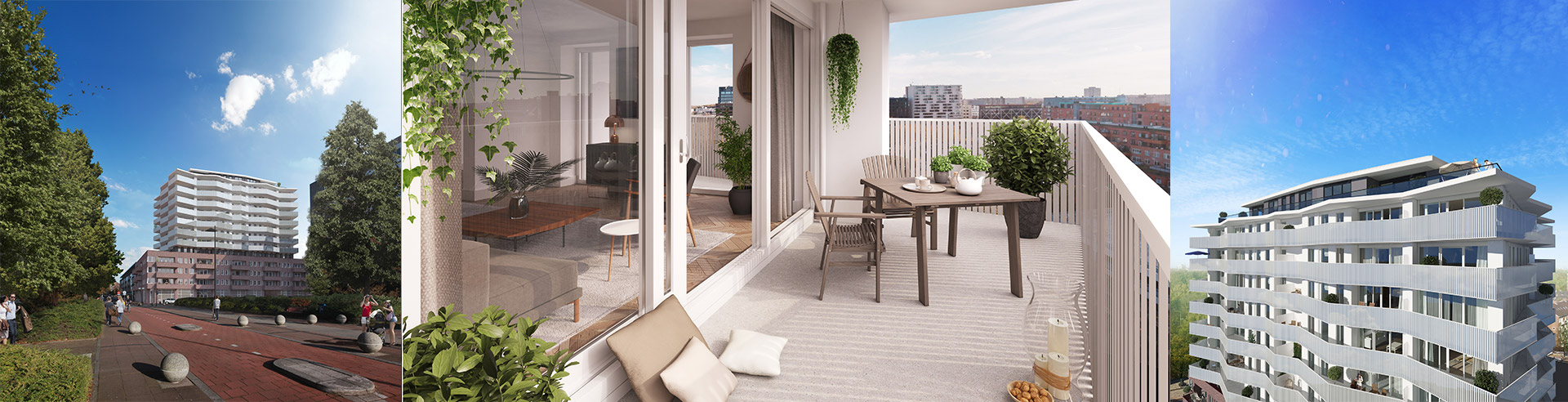Dit prachtige penthouse heeft een ruime woonkamer met een apart eet- en zitgedeelte en de mogelijkheid tot een open of afgesloten keuken. Er zijn drie ruime slaapkamers, een inpandige berging en een riant terras rondom.