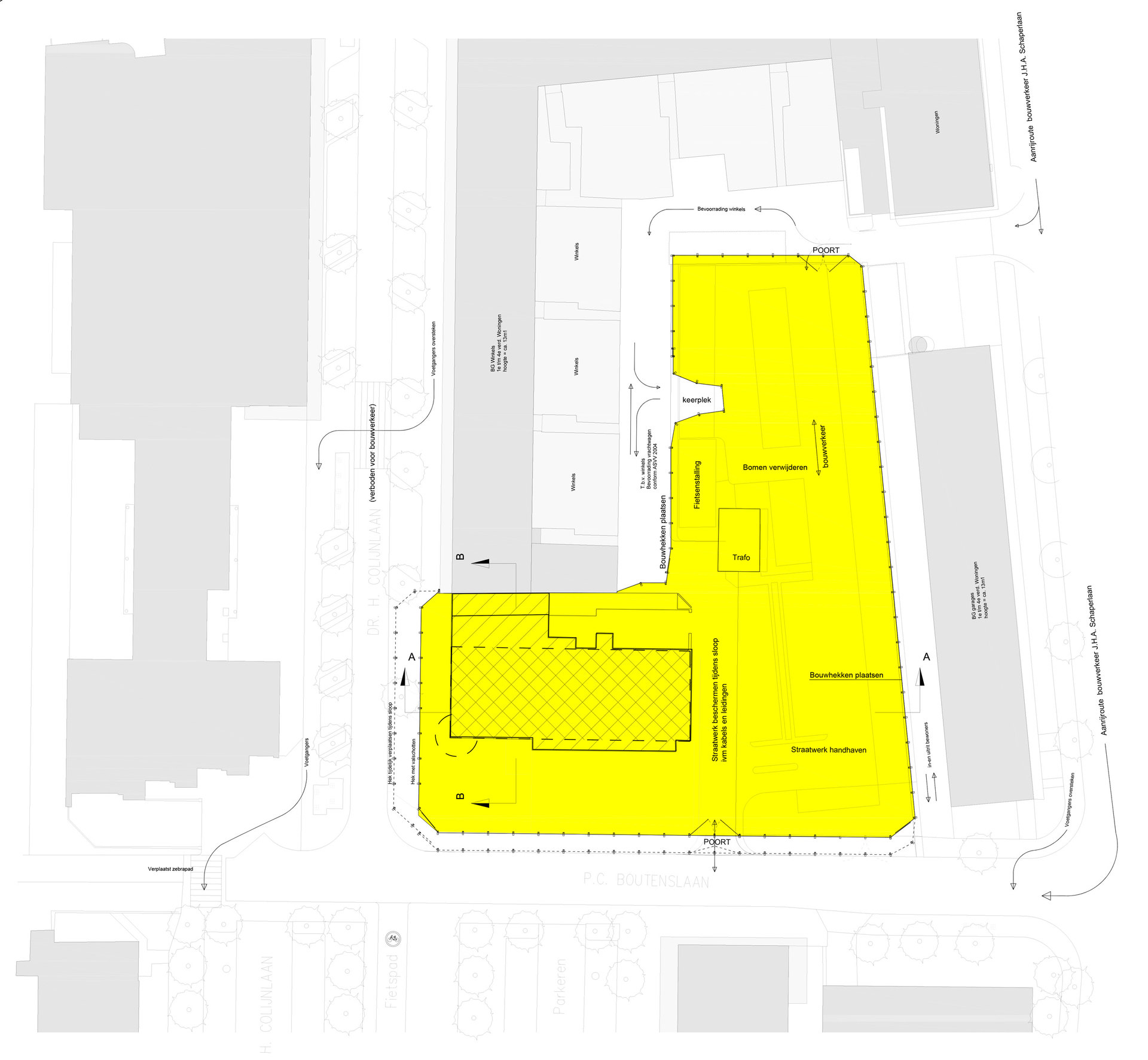 Het bestaande parkeerterrein zal worden afgesloten. Ten tijde van de sloop hebben wij dit nog gedeeltelijk kunnen openstellen voor personenauto’s. De toegang vanuit de P.C. Boutenslaan richting het achterterrein wordt afgesloten. Dit geldt voor de hele bouwperiode tot en met de oplevering. Hiervoor is bij de gemeente Rijswijk een verkeersbesluit aangevraagd. Dit betekent voor de winkeliers in de Dr. H. Colijnlaan dat de bevoorrading van hun winkels dient plaats te vinden via de J.H.A. Schaperlaan met een keermogelijkheid voor de vrachtwagens op het achterterrein. Hier is bij de inrichting van de bouwplaats rekening mee gehouden.